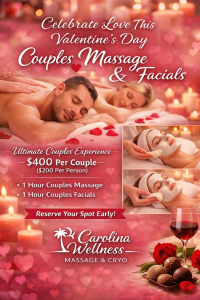 For Valentine’s Day, Carolina Wellness Massage & Cryo offers thoughtfully curated experiences designed specifically for couples. These options focus on relaxation, intimacy, and shared comfort rather than rushed spa schedules.